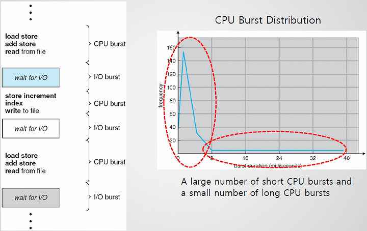: 계산 중심 프로세스는 적은 수의 매우 긴 CPU 버스트를 가지며, 입출력 중심 프로세스는 많은 수의 짧은 CPU 버스트를 가진다.